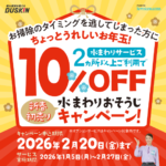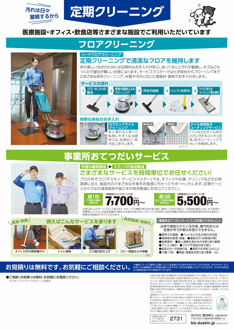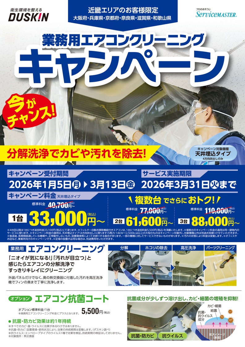 キャンペーン情報 新春初売り 水まわりおそうじキャンペーン 2026年1月5日(月)から2月27日(金)まで 2026年2月20日(金)まで お掃除のタイミングを逃してしまった方にちょっとうれしいお年玉! 水回りサービス 2ヶ所以上ご利用で、通常料金から 10% OFF ホームリペア事業開始!! 壁に空いた穴や床についたキズを、部分補修で傷つく前の美しさにリペア。 リフォームよりも短時間・低コスト・料金明瞭です。 お知らせコーナーに事業内容のご紹介をしております。 今まで以上にお客様に寄り添い、お困りごとの解決をお手伝いしていきます。 是非お問い合わせください! 業務用エアコンクリーニングキャンペーン 2026年1月5日(月)~2022年3月31日(火) 2026年3月13日(金) 近畿エリアのお客様限定! 天井埋込タイプ、4方吹き出し型エアコンのクリーニングを 割安のキャンペーン価格でご提供します。 複数台のお申し込みでさらにおトク! キャンペーン一覧へ